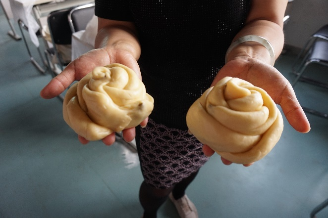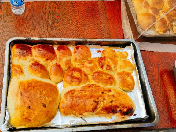 这时,面团已发酵完成,老师们充分发挥想象力,将面团做成各种喜欢的造型,有漂亮的花朵,有圆乎乎的甜甜圈,还有“简单粗暴”的面包山。经过一中午的古法烤制,大家终于品尝到了自己做的香喷喷的面包。