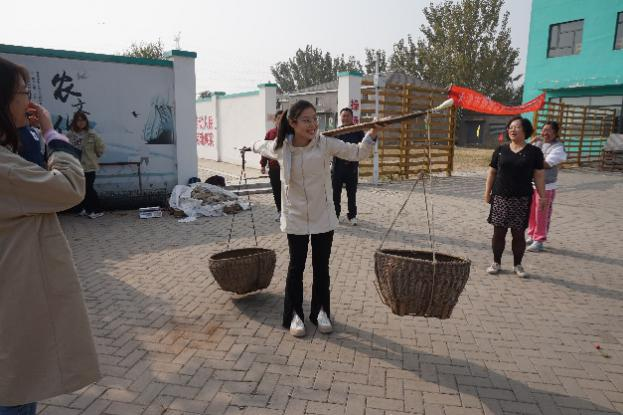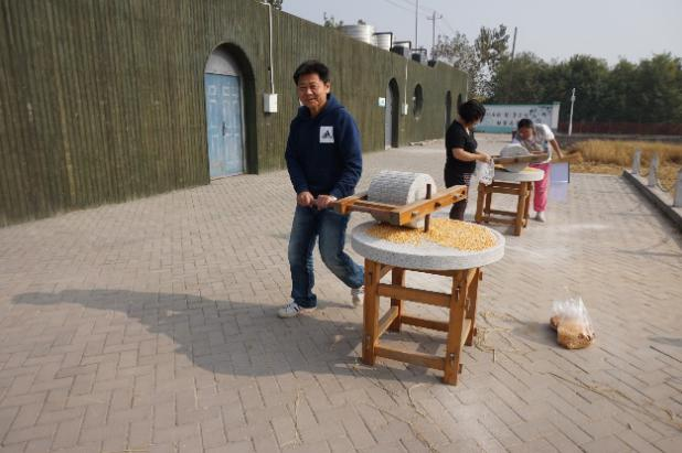 随后老师们还体验了“挑山工”、“磨玉米”等农活游戏。大多数老师平日里鲜有机会接触农活,没有挑扁担、转石磨的经历。大家参与热情高涨,认真学习如何才能将玉米磨得更细腻更均匀,体会劳动收获的乐趣。