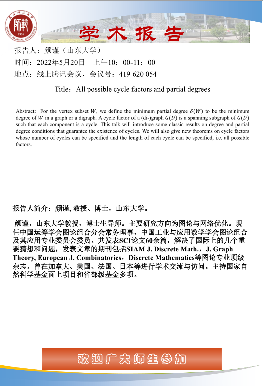 【预告】学术报告(2022-5)5月20日报告--All possible cycle factors and partial degrees