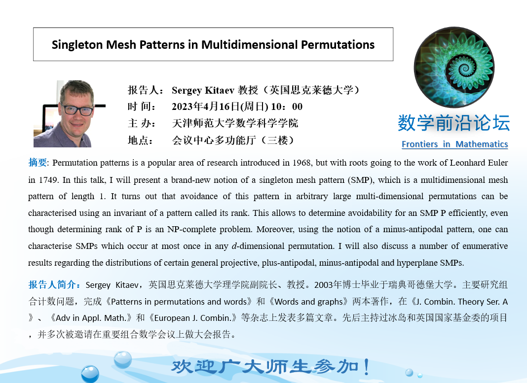 【预告】学术报告(2023-2)4月16日学术报告——Singleton Mesh Patterns in Multidimensional Permutations