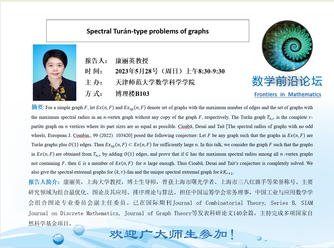 【预告】学术报告(2023-9)5月28日——Spectral Turan-type problems of graphs