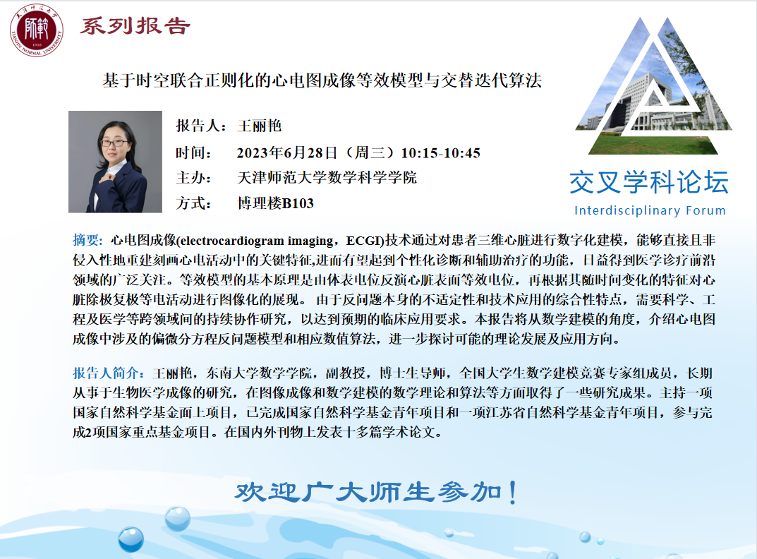 【预告】学术报告(2023-17)6月28日——基于时空联合正则化的心电图成像等效模型与交替迭代算法