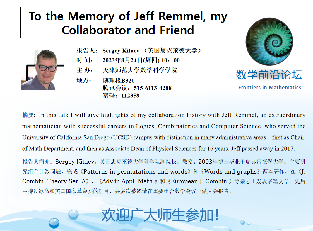 【预告】学术报告(2023-28)8月24日—To the Memory of Jeff Remmel,my Collaborator and Friend