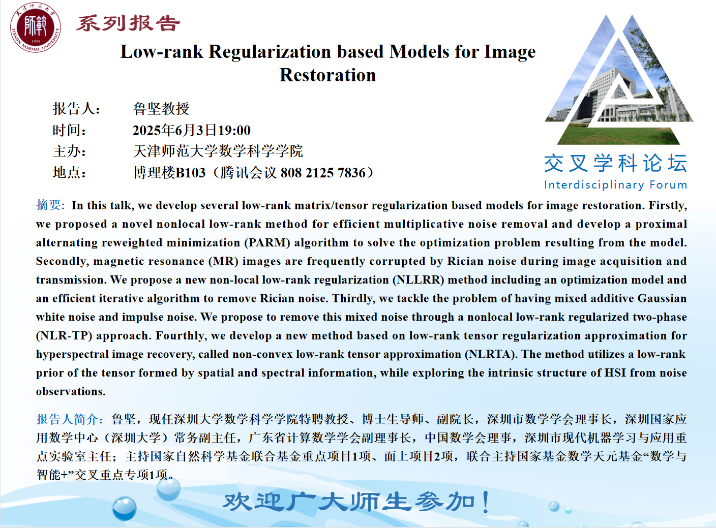 【预告】学术报告(2025-22)6月3日——Low-rank Regularization based Models for Image Restoration