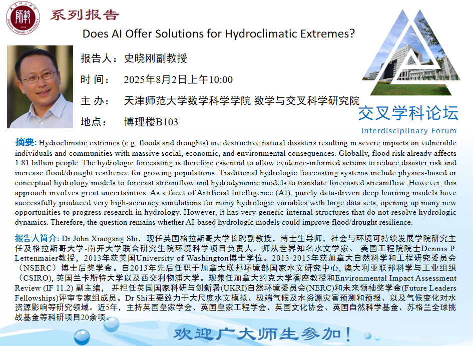 【预告】学术报告(2025-29)8月2日--Does AI Offer Solutions for Hydroclimatic Extremes?